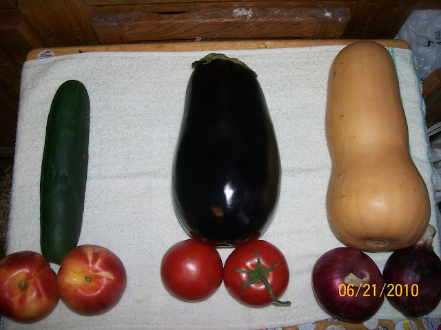 eggplant, red peppers, butternut squash, zucchini, red onions, marjoram, basil.