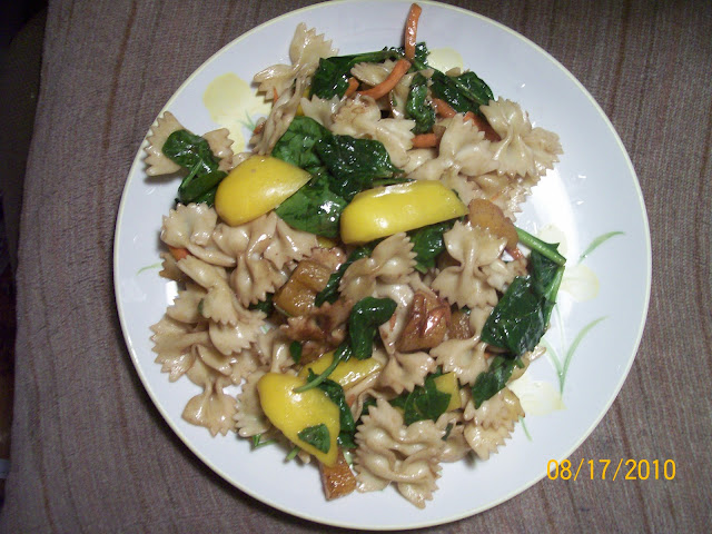 although dave russell should be pleased it is not rotini (although he is going to have to brace himself for the many rotinis in the near future). so—quick rundown: bowties, spinach, yellow peppers, dried apricots, i added shredded carrots to the recipe because i thought it needed more food in it, and a vinaigrette.