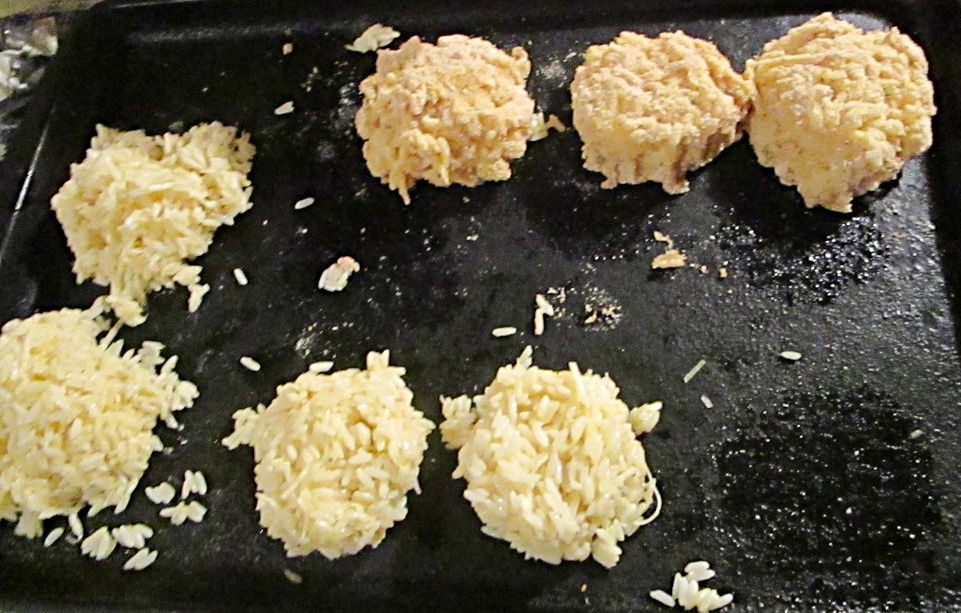 yes, but it’s not a perfect recipe. or maybe just an imperfect chef. i had a lot of difficulty making the rice balls stay in ball-form, especially when i went to put them in the egg wash and then roll them in the breadcrumb/cheese mixture. they kept falling apart. these were some of the more successful ones.
