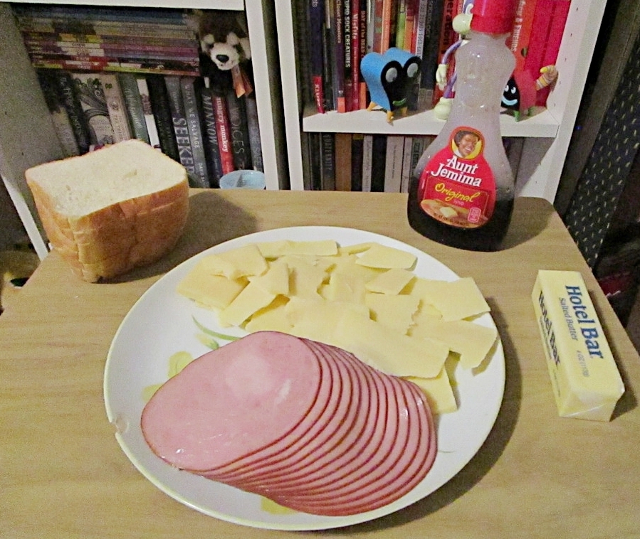 they didn’t brown up as nicely as they did in the picture from the book – many of them were soft instead of crispy, and it made a hell of a mess in the griddle – all sorts of loose bread crumbs blackening and wedging into the griddle squares. it was easy enough to clean, just a bit annoying to get into all those crannies. and i forgot to photograph the mess, oops. however, so far this project is fun and educational! oh, and tasty!