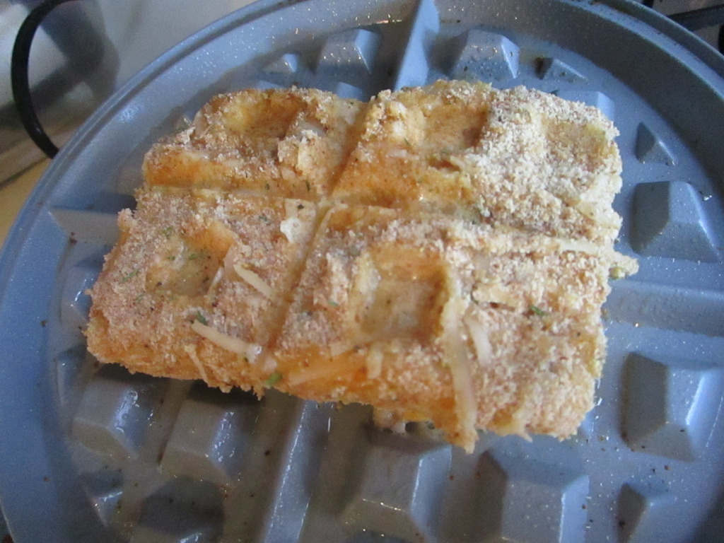 then you dip each wedge into flour, then an egg/salt/pepper bath, then into a bread crumb/parmesan cheese coating and then you’re ready to waffle