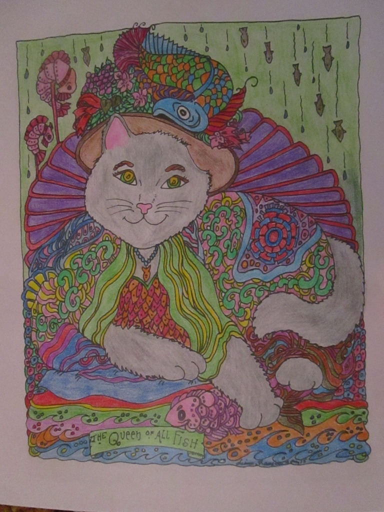 seriously, “surprise, it’s life?” that’s the worst. i don’t know if you can see all the little words and phrases and bits of feel-gooderie nonsense running along these pictures, or if i have colored too forcefully over them in my stoic but nonetheless outraged determination; but this one’s still pretty visible and it’s probably the stupidest one so far. unless your life is indeed like some sort of cross-eyed harlequin cat jack-in-the-box with balloons and toys and garbage everywhere. then i would suggest you start reviewing your life choices.