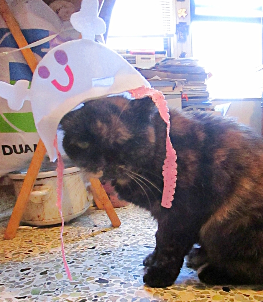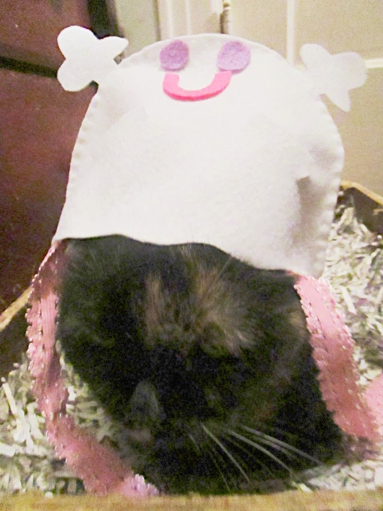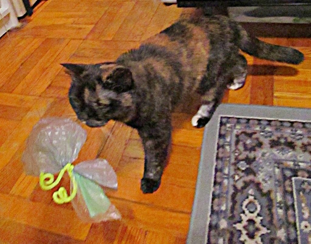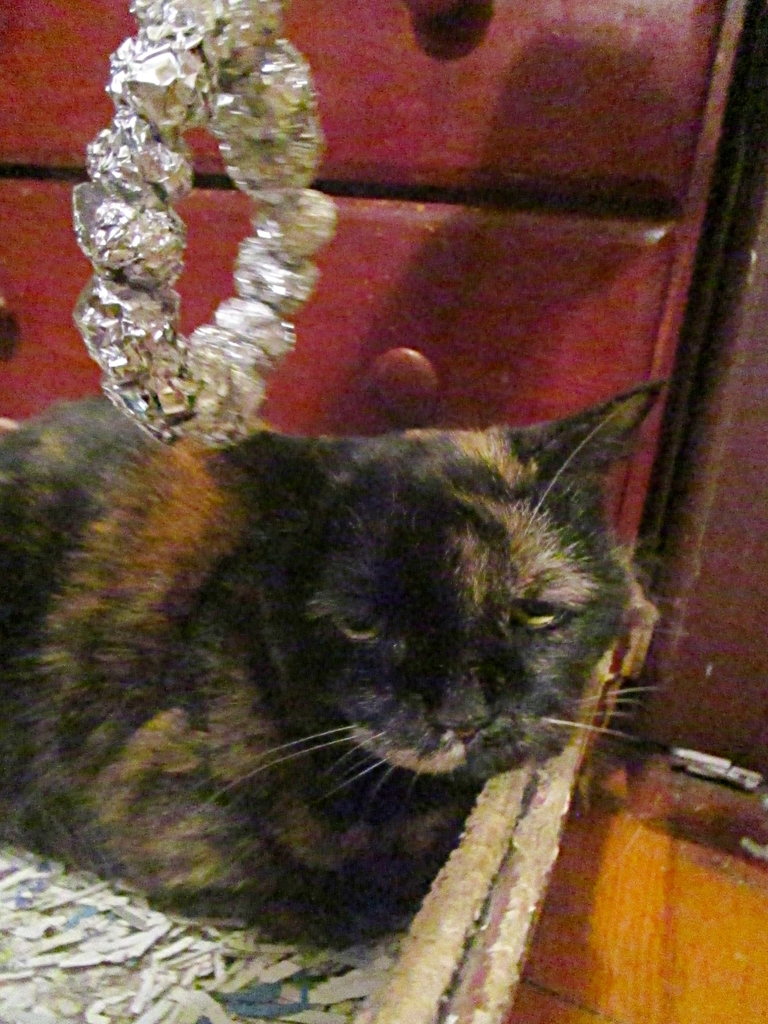 so, yeah – not the most successful project, and it was foolishly optimistic of me to try to cheer up a sick cat with such geegaws. BUT, in knock-on-wood news, she’s been really good the past couple of days, after a few bad days in a row around thanksgiving. she seems like my old maggie-goose, and even played ribbon with me in a really energetic way. and honestly, i wouldn’t put it past her to have been faking it this whole time just to get out of crafting, the clever girl…