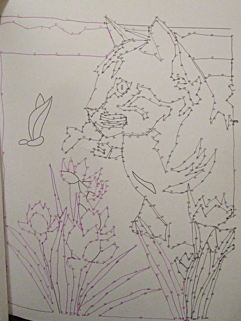 okay, you win, book: this time, i wasn’t sure what the finished product would be before i connected the dots. i knew where the cat would be, but i wasn’t sure what all the surrounding matter was. however, i stand by my earlier statement because, having connected the dots, i’m still not sure what the surrounding matter is. is it grass, bamboo? it is even vegetation or is it some bombed-out white picket fence? is she in JAIL? is this social commentary or nature documentary? is that spiky thing beneath her paws a dead bird or is that just wishful thinking?